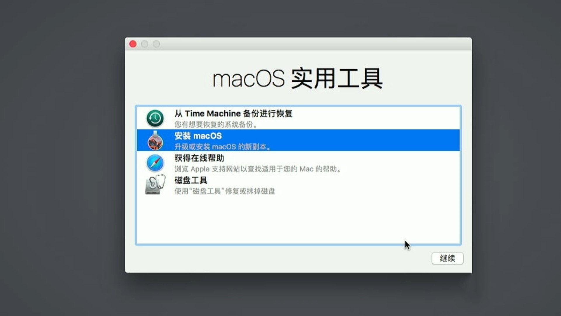 左上角 X 按钮退出磁盘工具,返回开始安装 macOS