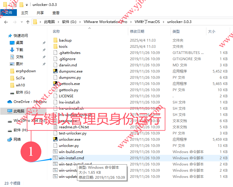 首先下载 MacOS Unlocker for VMware 压缩包,解压缩后,找到里面的 win-install.cmd,然后右键以管理员身份运行它。