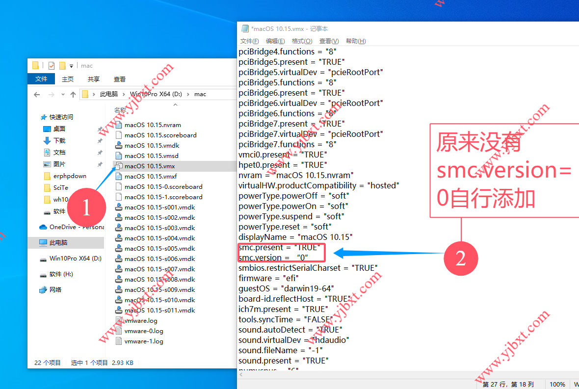3、需要注意的是,当我们创建好 Mac OS X 虚拟机后,我们先找到刚刚创建的虚拟机所在的目录,比如我的是安装到D盘的mac文件夹里,如果你的路径不一样,请找到你自己设置的路径,然后在这路径下找到后缀名为 .vmx 的文件,接着以记事本的方式将其打开,在里面先找到 smc.present = “TRUE”,然后在它下面添加一行:smc.version = “0”