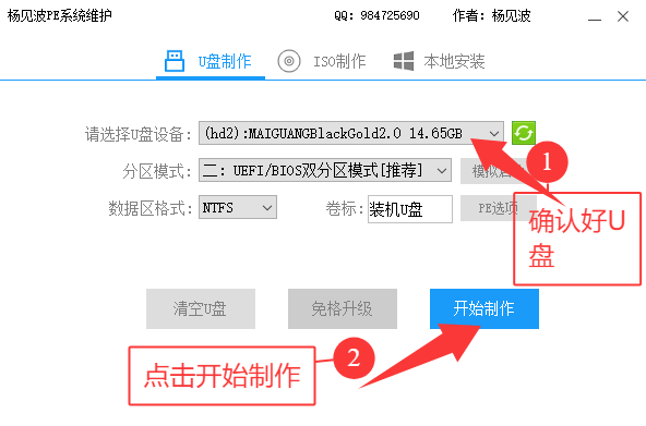 确认“选择U盘设备”是您刚刚插入的需要制作PE启动盘的U盘后点“开始制作”